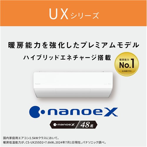 ●暖房能力No.1(2.5kW)(※国内家庭用エアコン2.5kWにおいて。暖房低温能力が、CS-UX255D2=7.6kW。2024年7月1日現在。2024年9月21日発売予定。(当社調べ)※)速く暖まり、暖かさが続く。