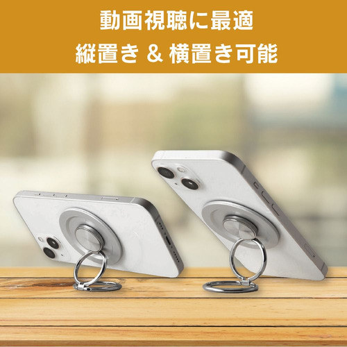 ・MagSafe対応端末・ケースにマグネット式で簡単着脱・360度回転、角度が自由自在・スマートフォンの縦置き・横置きどちらも可能。動画視聴に最適・MagSafe非対応端末・ケースでも使用可能になるアタッチメントリング付き