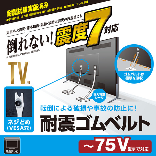 ●地震による家具・家電の転倒対策に!テレビ背面に取り付けることで、地震発生時の揺れを吸収し、転倒を防ぐ耐震ゴムベルトです。東日本大震災・熊本地震・阪神淡路大震災の再現波でも倒れない、震度7相当の振動試験をクリアしています。