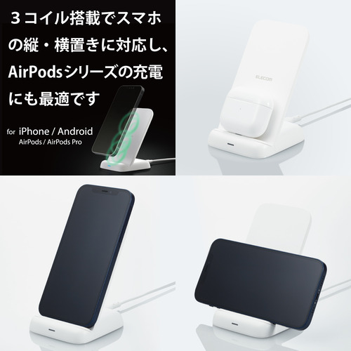 ●3枚のコイルを搭載し、スマートフォンを縦置き・横置きしても充電可能です。またAirPodsシリーズの充電も可能です。