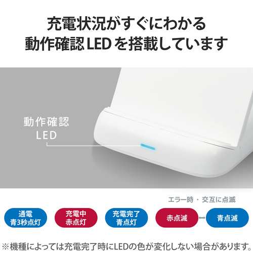 LED発光色:通電:青3秒点灯/待機:消灯/充電中:赤点灯/充電完了:青点灯/エラー時:赤青点滅 ※機種によっては充電完了時にLEDの色が変化しない場合があります。