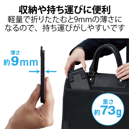 ●重さが約73gと軽量で、折りたたむと9mmの薄さになるので持ち運びや収納に便利です。