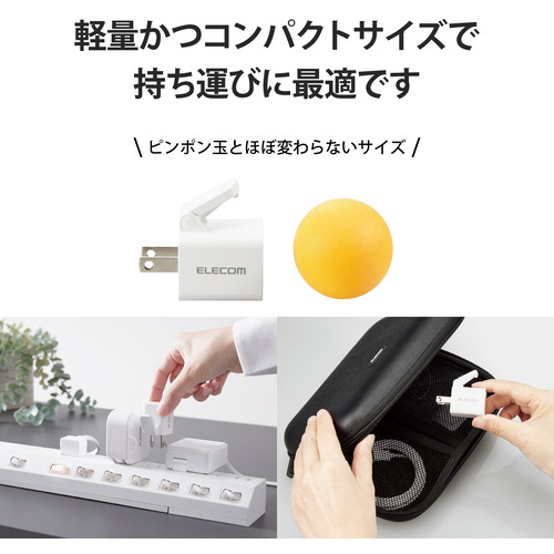●USB Type-C(TM)(USB-C(TM))ポートを搭載し、対応するスマートフォン、タブレットなどを超高速充電できるUSB AC充電器です。レバーを押すだけで片手で楽にコンセントやタップから軽い力で抜くことができるので、力の弱い子どもや高齢者の方に便利です。手のひらにすっぽり隠れるほど小さく、軽量なので外出や出張などの際の持ち運びに便利です。