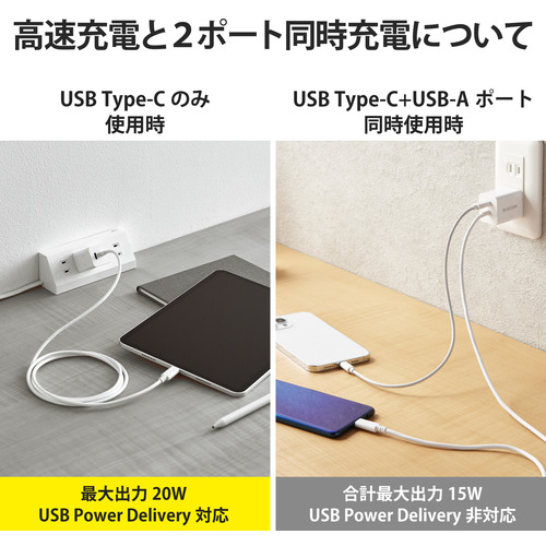定格出力電力:USB Type-C(TM)(USB-C(TM))ポート:最大出力20W、 USB Type-C(TM)(USB-C(TM))コネクター:最大出力20W、 2ポート同時出力時:合計最大15W(USB Power Deliveryでの出力はできません)