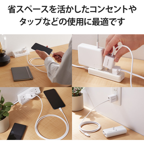 ●USB Type-C(TM)(USB-C(TM))ポートとコネクターを搭載し対応するスマートフォン、タブレットなどを超高速充電できるUSB AC充電器です。手のひらにすっぽり隠れるほど小さく、軽量なので外出や出張などの際の持ち運びに便利です。USB Type-C(TM)(USB-C(TM))コネクターの一体型ケーブルはゆったり接続できる長さ1.5mです。