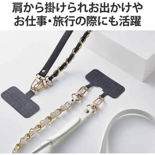 ●肩から掛けられ、バッグやポケットから取り出さなくてもすぐにスマートフォンの操作ができるショルダーストラップです。ケースにストラップホールがなくても、付属のストラップシートをスマートフォンとケースの間に挟むだけで使用できます。柔らかく上品なソフトレザーや高級感のあるゴールドのチェーンを採用し、シックな装いになじむデザインなので、モード系やクールな服装などにも合わせて使えます。