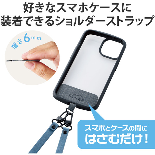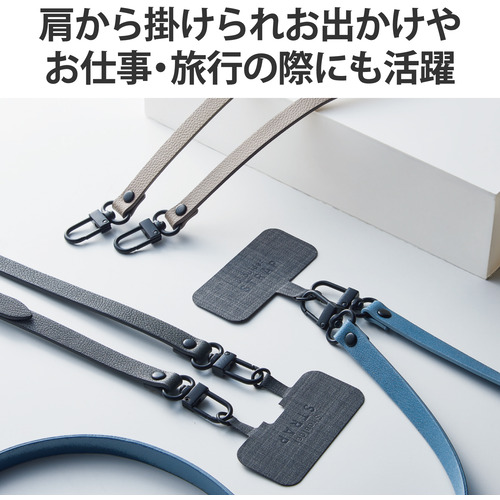 ●肩から掛けられ、バッグやポケットから取り出さなくてもすぐにスマートフォンの操作ができるショルダーストラップです。