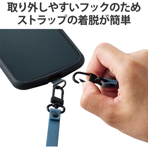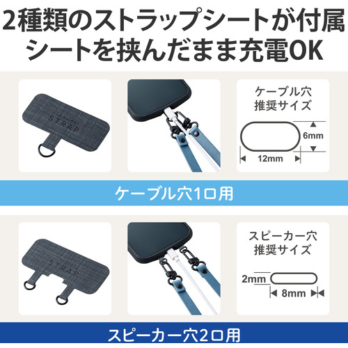 ●ケースにストラップホールがなくても、付属のストラップシートをスマートフォンとケースの間に挟むだけで使用でき、取り外しも簡単です。