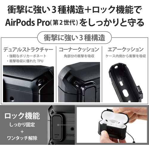 ●落下時に本体の飛び出しを防ぐロック機能付き!3つの衝撃吸収構造で衝撃から守るAirPods Pro (第2世代)用ZEROSHOCK Lockケースです。