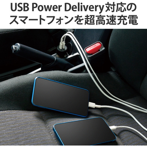 ●USB Power Delivery規格に準拠したUSB Type-C(TM)(USB-C(TM))ポートを2つ搭載し、スマートフォンなどの端末を2台同時に高速充電できる車載充電器です。合計最大40Wで高速充電が可能です。