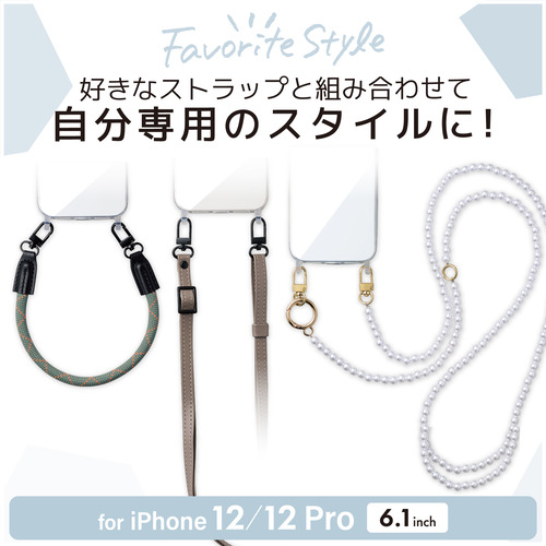●側面に弾力性のあるTPU素材を、背面に強じんで透明度の高いポリカーボネート素材を使用しています。持ち運びに便利なスマホショルダーストラップやハンドストラップが取り付けられる、スリムなスタイルのiPhone 12、12Pro用ハイブリッドケースです。 ※本製品にストラップは付属していません。