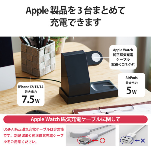 ●MagSafe対応iPhoneシリーズ、ワイヤレス充電対応のAirPodsシリーズ、さらにApple Watch磁気充電ケーブルをはめ込むことでApple Watchシリーズも3台同時にワイヤレス充電できる充電器です。 iPhoneはマグネットで固定し7.5Wで充電ができます。また縦置き・横置きどちらでも対応し、充電しながら着信確認や動画視聴ができます。 AirPodsシリーズは台座部に置くだけ、Apple Watchシリーズはバンドを付けたまま設置するだけで簡単に充電が可能です。