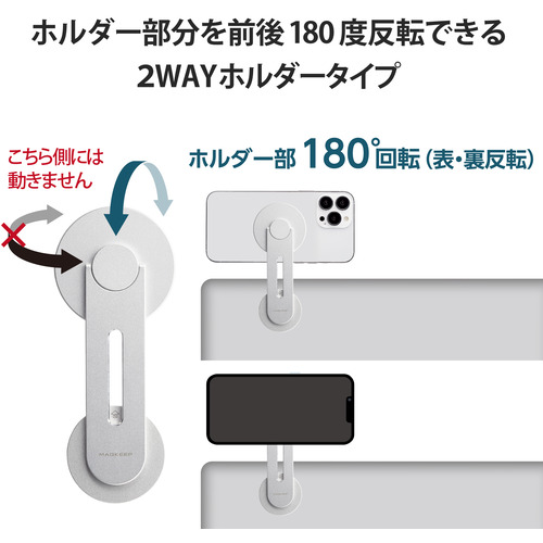 ●ホルダー部分が前後に180度反転することで、装着したままiPhoneの画面側とメインカメラ側の向きが簡単に変えられます。