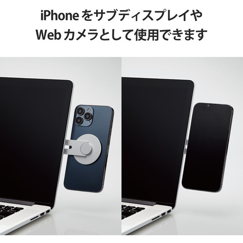 ●パソコンのディスプレイの背面に貼り付けて、iPhoneスタンドとして使用できるマグネット式ディスプレイアームスタンドです。iPhoneをサブディスプレイやWebカメラとして使用できます。ホルダー部分が前後に180度反転することで、装着したままiPhoneの画面側とメインカメラ側の向きが簡単に変えられます。 ※MagSafeに対応しているiPhoneで使用できます。※iPhoneをWebカメラとして使用するには、macOS Ventura 13が必要です。