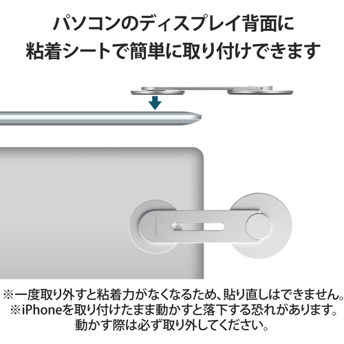 ●パソコンのディスプレイの背面に貼り付けて、iPhoneスタンドとして使用できるマグネット式ディスプレイアームスタンドです。