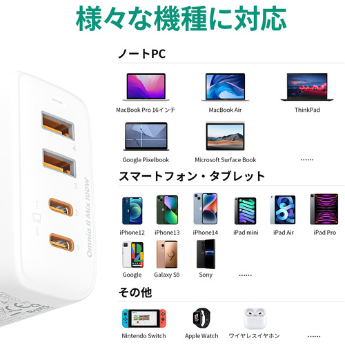 USB-Cポートを1ポートのみ使用した場合の最大出力は100Wで、あらゆるノートPCの充電に使用が可能です。もちろん、タブレット・ゲーム機・カメラなどの充電にも使用可能です。