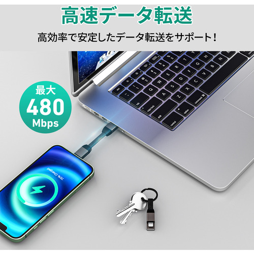 Lightning機器へ最大2.4Aの高出力に対応し、急速充電が可能です。また、480Mbpsのハイスピード転送も可能です。高効率で安定したデータ転送を保証します。これ一つで充電にもデータ転送にも使用できます。