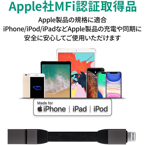 AppleのMFi認証を取得しています。Apple製品に安心してご使用いただけます。