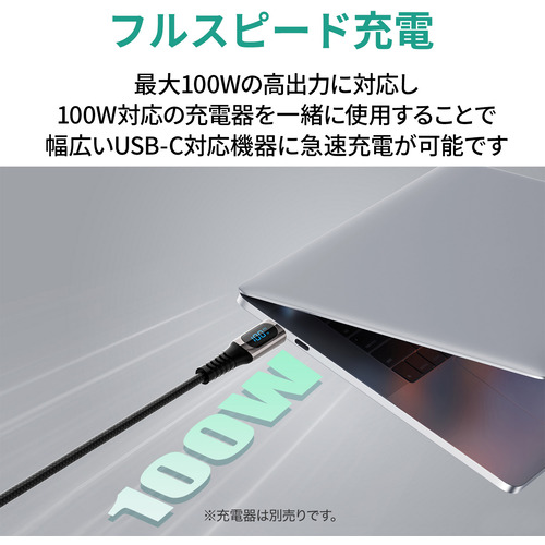 USB PD (Power Delivery)による最大100W (20V/5A)の急速充電に対応しています。Type-C端子搭載のパソコン、スマートフォン、タブレット、充電器やゲーム機器など、さまざまなUSB-C機器の充電に最適です。