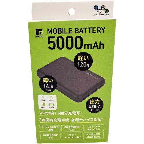 Tuna モバイルバッテリー5000mAh黒 2ポート 出力2.1A 入力2.1A GWP-SL5A221B
