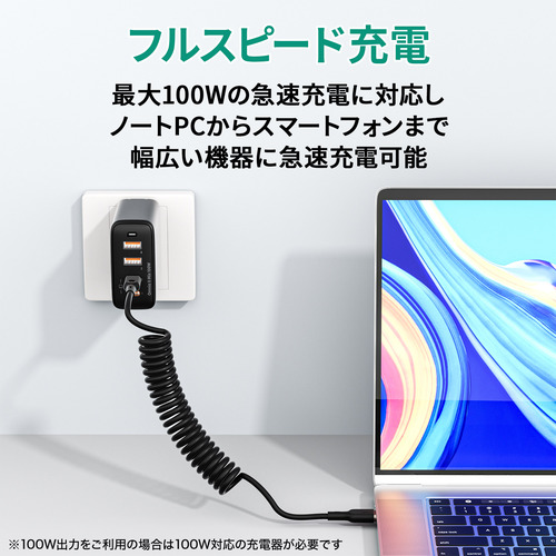 最大100Wの高出力に対応し、USB-C機器の急速充電が可能です。