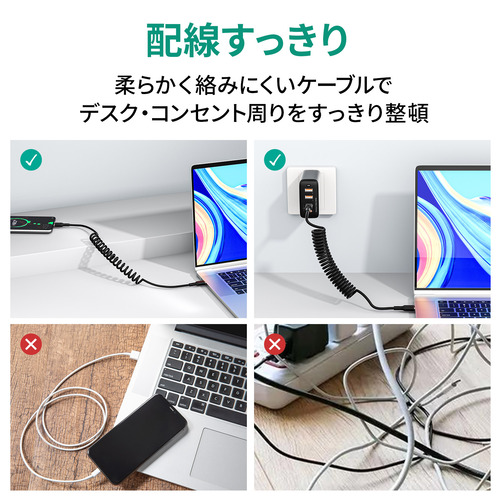 ●約35cmから最大約150cmまで伸縮可能なコイル型C-Cケーブル
