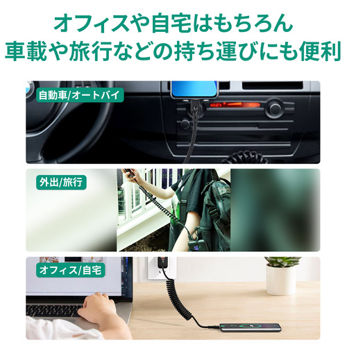 使用状況に合わせて約35cmから最大約150cmまで伸ばすことができるコイル形状のケーブルです。コンパクトに縮められるので車のコンソールボックスなどに収納が可能です。