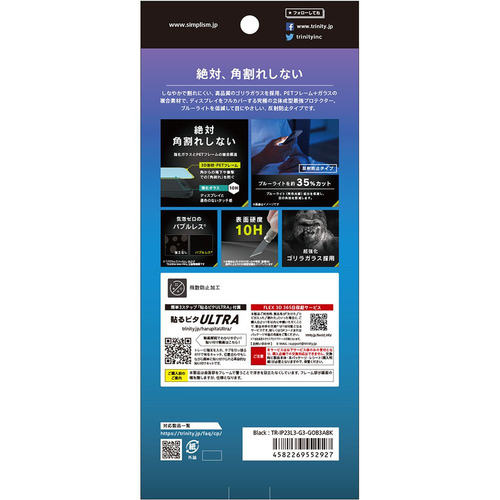 ・端まで守る、フルカバーフレームタイプ・光の映り込みを抑え、指すべりさらさらな反射防止タイプ・ブルーライトを低減して目が疲れにくい・しなやかで割れにくい、高品質の超強化ゴリラガラス採用・簡単3ステップで貼り付け「貼るピタUltra」採用、専用埃テープ付属・気泡ゼロの「バブルレス」仕様・表面硬度10Hで傷から徹底ガード・飛散防止加工・FLEX 3Dガラス、365日安心保証サービス・マイクロファイバークロス付属