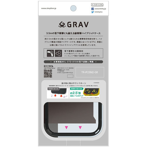 ・側面はしなやかな素材で衝撃を吸収・背面に表面硬度5H ウルトラファインアクリル採用・落下衝撃を分散吸収する、ハニカムコア構造・ストラップホール付き・米軍規格MIL-STD-810の落下試験に準拠・ケースに入れたままカメラ撮影が可能・ケースに入れたまま各種ボタンの操作が可能・ボタン周りの凹凸もしっかり保護・音が前に飛んでくるサウンドホーン