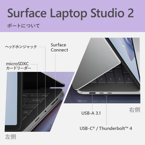 外部接続端子:USB-C 4.0/Thunderbolt 4 対応 USB-C × 2、USB-A 3.1 × 1、3.5mm ヘッドセット ジャック、microSDXC カードリーダー、Surface Connect (充電、 Surface ドック用端子)、充電可能な Surface スリム ペン 2* の充電ストレージ