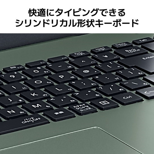 打ちやすい「こだわりのキーボード」は、適度な傾斜がつくことで入力しやすくなる「リフトアップヒンジ」や、タイピング音で周囲に迷惑をかけない静音設計を採用。また、パスワード不要ですばやくサインインできるWindows Hello対応 指紋認証センサを搭載。本体カラーは、日常のインテリアになじむオリーブグリーンです。