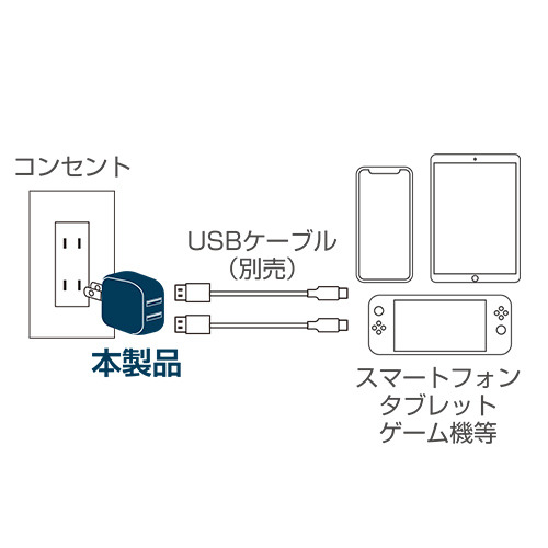 合計5V/2.4A出力が可能で合計2台までのUSB充電が可能なACアダプタです。スマートフォンだけでなく、各社タブレットの充電にも対応しています。