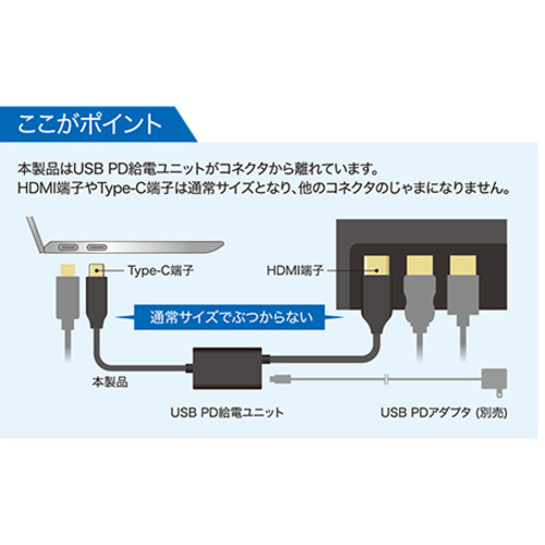 USB PD対応で給電しながらスマートフォンやPCの画面をTVに映せます。▼ここがポイント本製品はUSB PD給電ユニットがコネクタから離れています。HDMI端子やType-C端子は通常サイズとなり、他のコネクタのじゃまになりません。