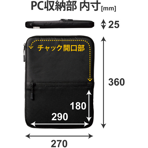 PC収納部内寸:幅約270mm×厚さ約25mm×高さ約360mm