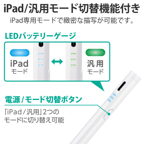 ●スイッチを長押しするだけで、iPadモードと汎用モードに切り替えられる、充電可能なアクティブタッチペンです。ペン先が約1.5mmで繊細な描き込みが可能。ペアリングなどは不要で、電源をオンにするだけですぐに使用でき、バッテリー残量は3つのLEDランプでお知らせします。iPadモードは手が触れても誤動作しないパームリジェクション対応です。
