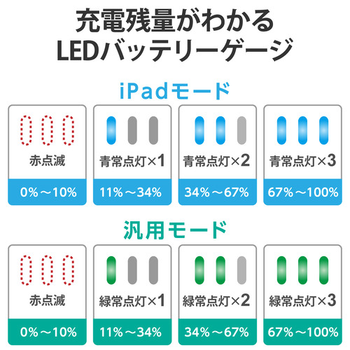 ●LEDランプが、iPadモードは青、汎用モードは緑に光るので、使い分けが簡単です。