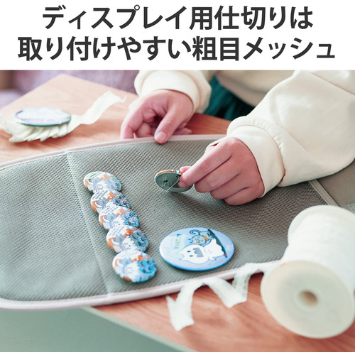 ●ディスプレイ用仕切りには、ストラップや缶バッジを取り付けやすい粗目のメッシュ生地を採用しています。