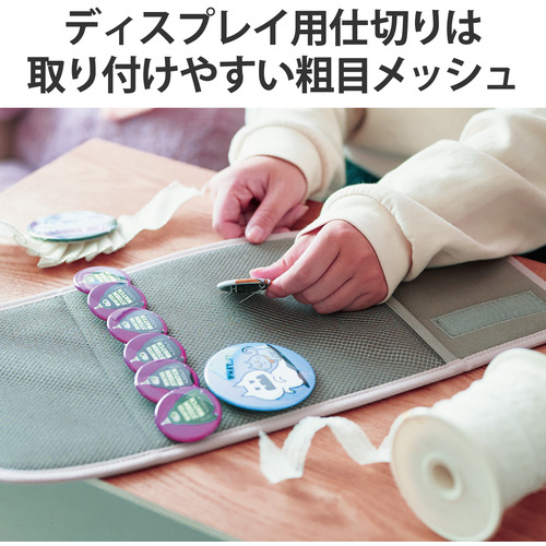 ●ディスプレイ用仕切りには、ストラップや缶バッジを取り付けやすい粗目のメッシュ生地を採用しています。