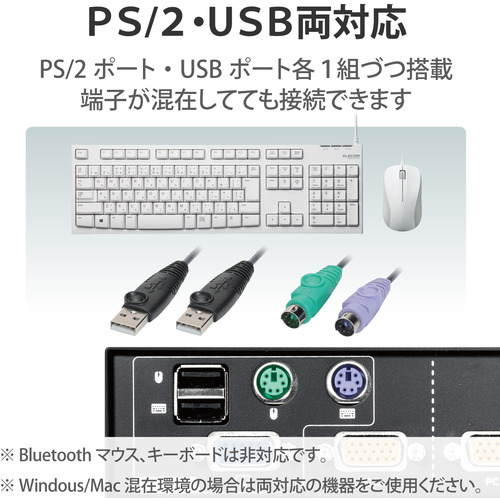 インターフェース(コンソール側):マウス:ミニDIN6ピン(PS/2)メス×1、USB-Aメス×1 / キーボード:ミニDIN6ピン(PS/2)メス×1、USB-Aメス×1 / ディスプレイ :D-Sub 15ピン(VGA) メス×1