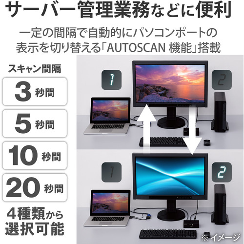 ●1組のマウス、キーボード、VGAディスプレイで、2台のパソコンを切り替えて操作可能!エミュレーション機能によって、デバイス切り替え時の接続がスムーズに。さらに、サーバー管理業務などに便利な、一定の間隔で自動的にパソコンポートの表示を切り替えるAUTOSCAN機能を搭載したパソコン切替器(KVM)。