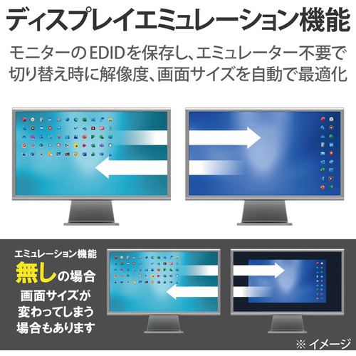 ●“ディスプレイエミュレーション機能”を標準搭載し、エミュレーターを追加しなくても、モニターのEDIDを保存し、パソコンの切り替え時に解像度、画面サイズを自動で最適化します。