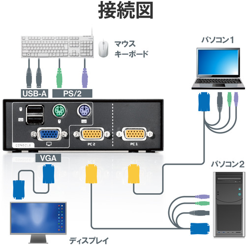 ●1組のマウス、キーボード、VGAディスプレイで、2台のパソコンを切り替えて操作できるパソコン切替器(KVM)です。