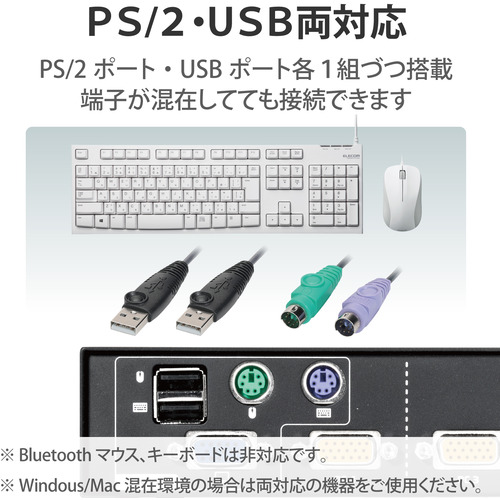 インターフェース(コンソール側):マウス:ミニDIN6ピン(PS/2)メス×1、USB-Aメス×1 / キーボード:ミニDIN6ピン(PS/2)メス×1、USB-Aメス×1 / ディスプレイ :D-Sub 15ピン(VGA) メス×1