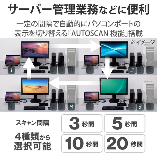 ●1組のマウス、キーボード、VGAディスプレイで、4台のパソコンを切り替えて操作可能!エミュレーション機能によって、デバイス切り替え時の接続がスムーズに。さらに、サーバー管理業務などに便利な、一定の間隔で自動的にパソコンポートの表示を切り替えるAUTOSCAN機能を搭載したパソコン切替器(KVM)。