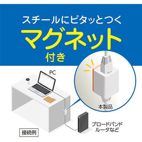 デスクなどのスチール面にくっつけて設置できるマグネット付きです。オフィス環境などで取り回しよく使えます。