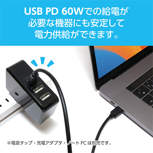 USB PD 60Wでの給電が必要な機器にも安定して電力供給ができます。