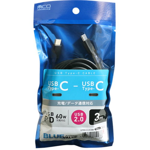ミヨシ UYM-CC203BK USB2.0ケーブル USB PD 60W充電対応 充電/データ通信 Type-Cタイプ ブラック UYMCC203BK