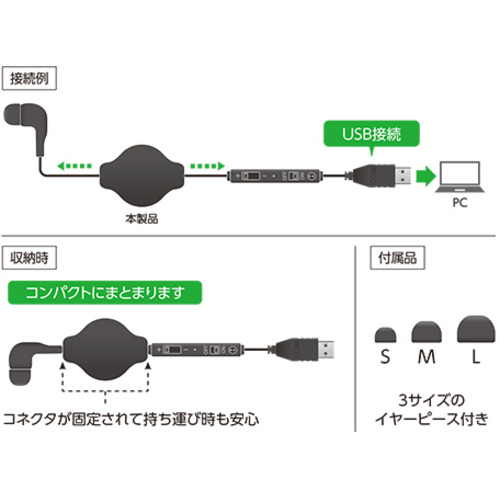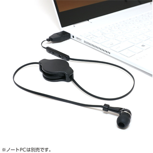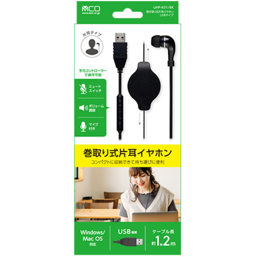 ミヨシ UHP-K01/BK 手元コントローラー付き 巻取り式 片耳イヤホン USBタイプ ブラック UHPK01/BK
