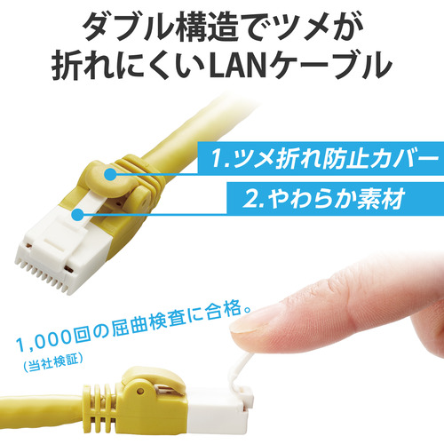 ●ツメ折れ防止プロテクターと屈曲に対する耐久性が高い新素材コネクターを採用したダブル構造で、ツメが折れにくいLANケーブルです。 ※1000回の屈曲検査に合格(当社検証)