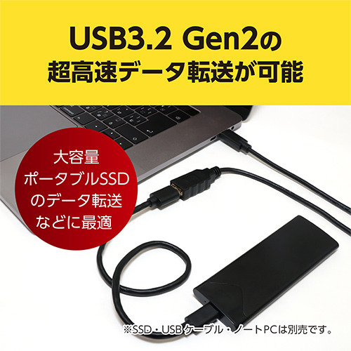USB3.2 Gen2対応でUSB A搭載PCに超高速データ転送できます。最大10Gbps(理論値)の超高速データ転送が可能です。大容量ポータブルSSDのデータ転送などに最適です。※接続機器、ケーブルがUSB3.2 Gen2に対応している必要があります。